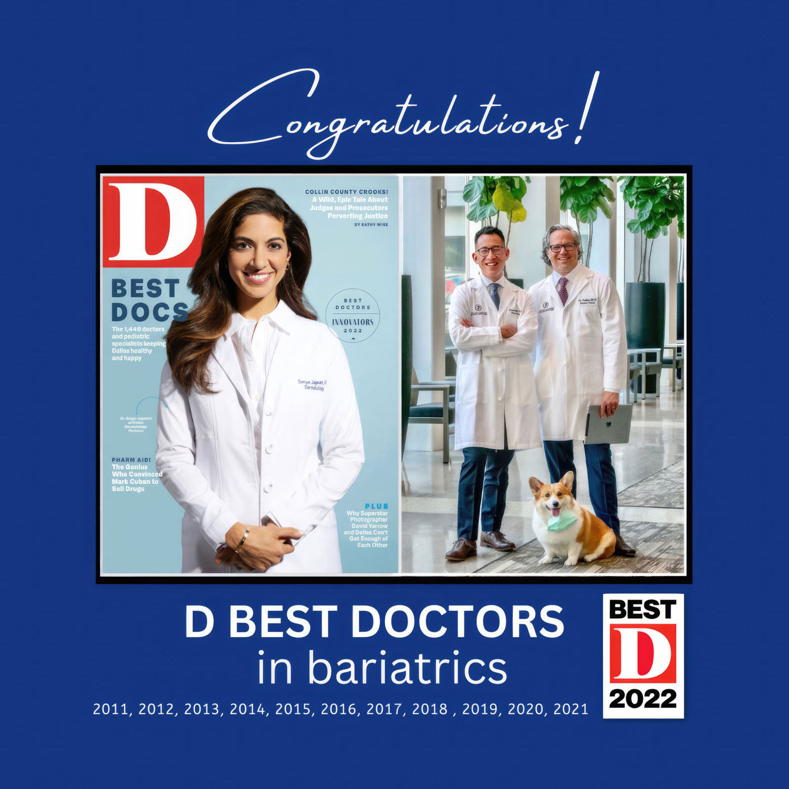 Many patients adore our office dog who puts them at ease and makes them feel welcome and comfortable. If you have surgery at Texas Health, Baylor, or Medical City and would like Marty to visit you in the hospital, we can make arrangements.